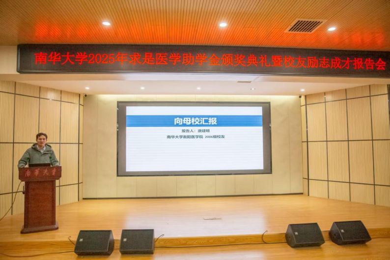 活动尾声,2011届杰出校友唐建明带来了精彩纷呈的励志成才报告。作为国家高层次人才计划青年拔尖人才、甘肃省领军人才(第二层次)、兰州大学第一医院博士生导师,唐建明校友围绕母校情怀、学术背景与研究历程、成果转化与创新实践三个维度,生动分享了自己从南华求学、步入职场到深耕科研的奋斗故事。报告中,他展现出的自强不息、追求卓越的精神品质,以及对母校的深厚眷恋与牵挂,深深感染了在场每一位师生。