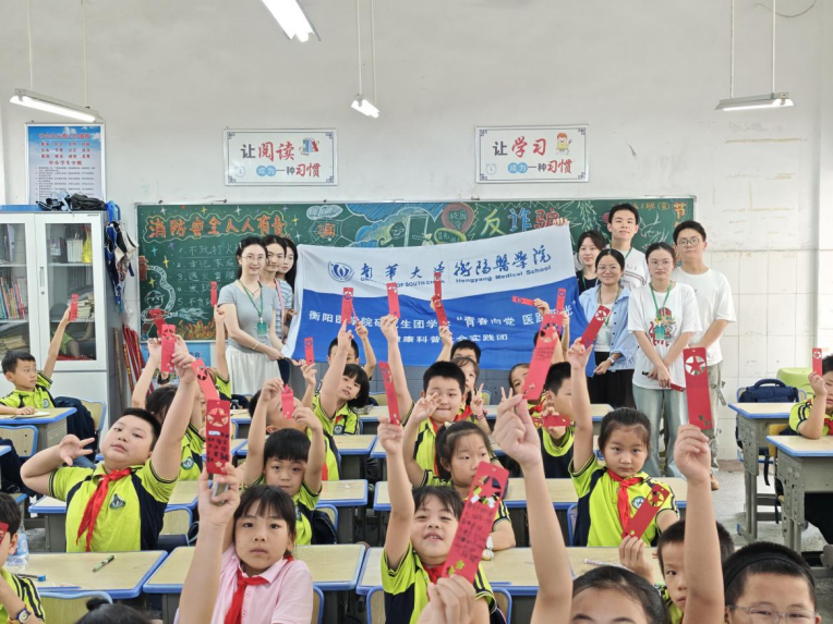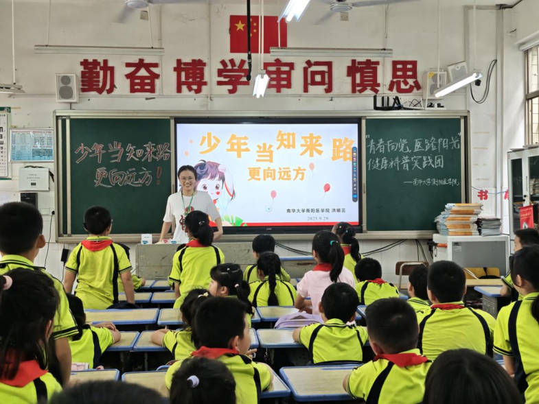 为纪念中国人民抗日战争暨世界反法西斯战争胜利80周年,深刻铭记历史荣光、赓续红色基因,在国家烈士纪念日即将来临之际,2025年9月29日下午,南华大学衡阳医学院“青春向党,医路阳光”研究生健康科普实践团走进蒸湘区实验小学开展“一院一品”活动,给三年级(1)班的小学生们带来了一场以“少年知来路,更向远方”为主题的纪念抗战胜利宣讲活动,让红色种子在少年心中生根发芽。