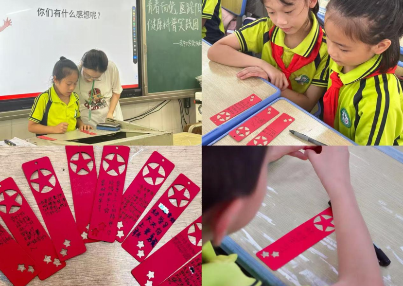 活动尾声,洪娜芸为每位同学送上定制书签,邀请大家分享学习感悟。“革命先烈用生命换来了现在的和平,我们要对他们说声谢谢!”“以后我要好好学习,长大为国家做贡献!”孩子们稚嫩的声音里满是坚定,真挚的分享赢得了师生们的阵阵喝彩。