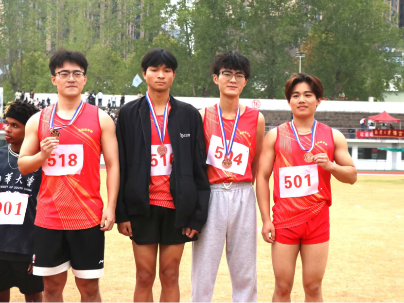 11月1日下午,南华大学大运会男子4×100米接力决赛在田径场燃情开赛。由本25生物技术02班郑浩浚、本23医卓02班的陈鑫、本24医卓01班的彭继开和本23临医12班的刘圣杰组成的基础医学院接力队在前三棒暂处劣势的逆境中,凭借不放弃的斗志与默契配合奋勇追赶,最终以48秒70斩获季军。