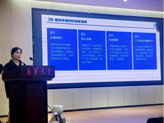 活动伊始,团委书记金锦涛为分享会致辞。他不仅为同学们清晰梳理了奖项关键信息,还着重强调了榜样引领在成长中的重要作用,鼓励大家以优秀学长学姐为榜样,勤学善思、勇攀高峰,在医学专业领域扎实积累、追求卓越,让在场学子对国家奖学金有了更深刻的认识与向往。