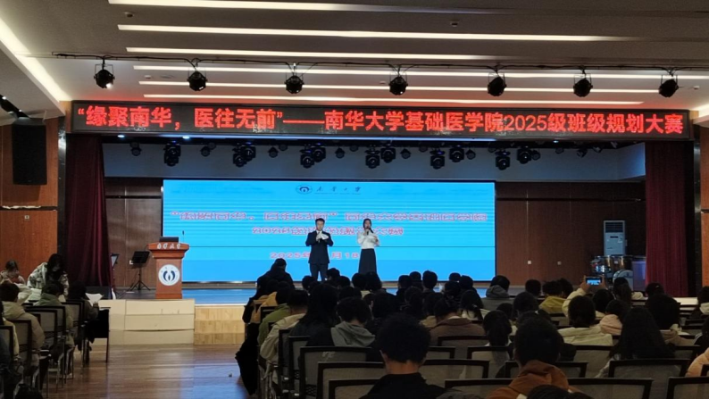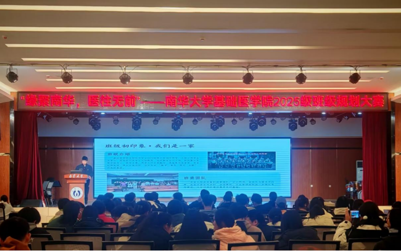 为加强新生班级建设,夯实学风基础,营造良好班风,提升班级凝聚力,基础医学院25级团总支学生会于11月18日晚在北校活动中心举行“缘聚南华,医往无前”班级规划大赛。基础医学院党委副书记卢清华、团委书记金锦涛,24级辅导员胡奉佳,25级辅导员苏玲、夏泽华,25级各班班主任及班委代表共同参会。本次活动由师宇杰、周子璇主持。