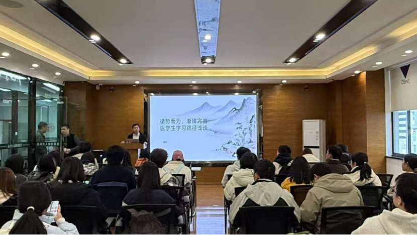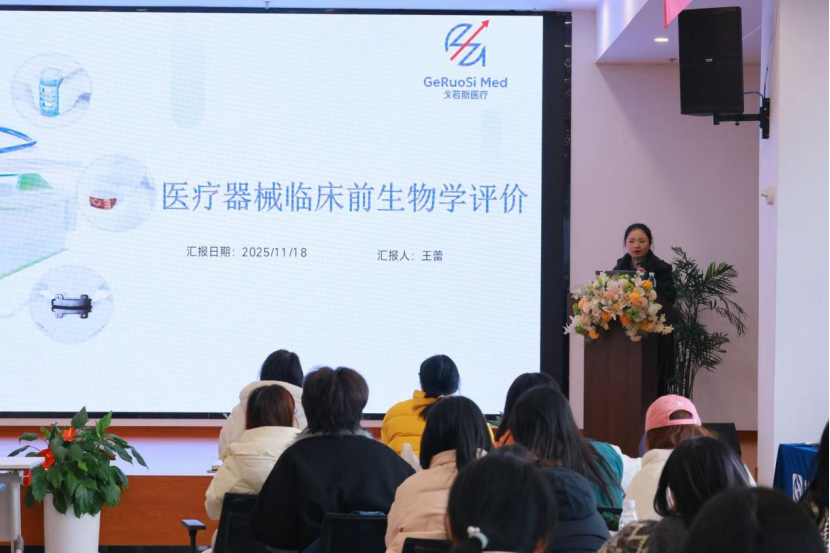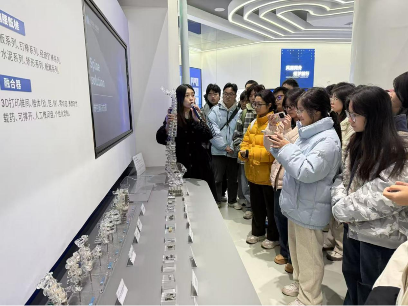 午后稍作休整,团队前往湖南华翔医疗公司。在公司负责人带领下,学生参观企业展厅,近距离了解3D 打印钽材料在肿瘤治疗中的应用、可降解锌合金心血管支架等创新成果。随后,在会议室内,王国华总经理向同学们介绍了医疗器械分类与产业发展现状,强调了3D打印技术 “从病症适配产品到个性化定制” 的研发理念;潘鹏博士、浣溢帆工程师、王蕾博士分别围绕原材料制备、医学- 工程学 - 材料学交叉应用以及临床前生物学评价等主题分享专业见解,让学生们深刻感受科技创新对医疗行业的推动作用。