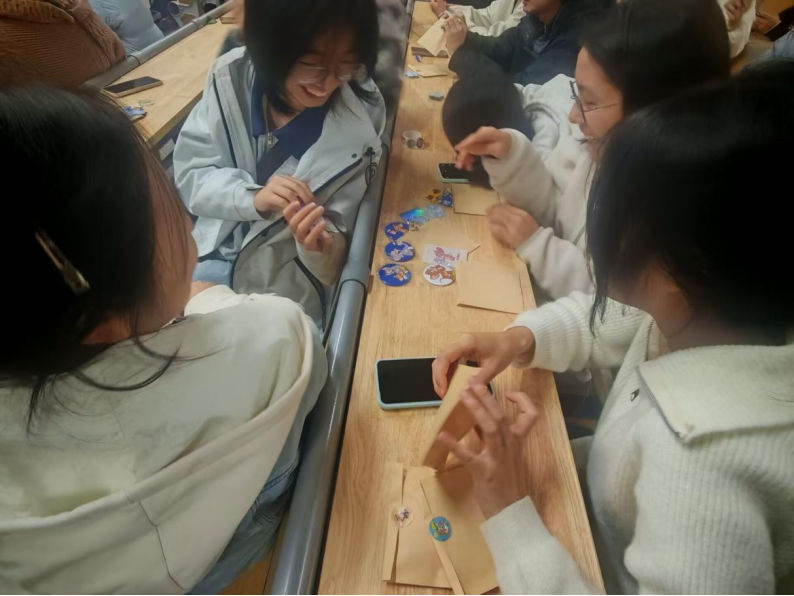 活动第一阶段在南华楼111教室进行。周慧云播放趣味小视频,通过轻松幽默的内容、丰富有趣的图片、活泼欢快的音乐迅速点燃现场氛围,让同学们在阵阵欢笑打破了初次见面的拘谨,为接下来的深度交流做好了暖场准备。随后,进入“治愈故事”环节,同学们积极地分享自己向他人伸出援手或接受他人帮助的小故事,如考试失利后的安慰拥抱、他人难过时递出的一张纸巾、摔倒后扶起自己的有力臂膀等等,无论是给予还是被给予,都在漫漫人生中持续治愈温暖着大家。在“情绪盲盒”互动环节中,同学们围绕抽中的情绪,交流了独属于自己的微小却真实的瞬间,引导同学们进行深刻的自我觉察,让同学们在倾听与倾诉中体会情感共鸣,释放压力的同时建立相互间的情感联结。