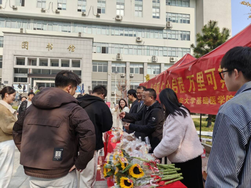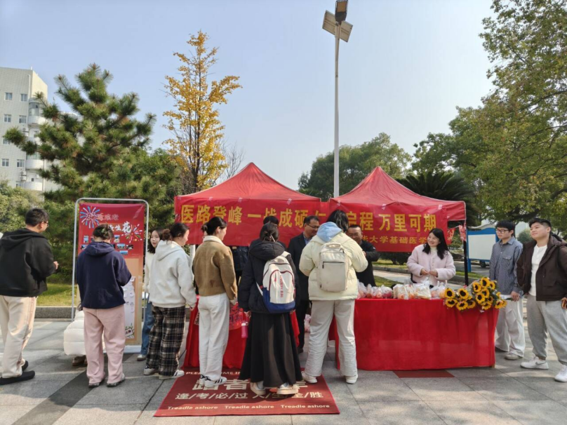 为缓解正处于考研冲刺关键阶段的医学生备考压力,享受一次轻松、温暖的体验互动,坚定冲刺信心,以更好的心态迎接即将到来的研究生入学考试。2025年12月10日上午,南华大学基础医学院在红湘校区图书馆前坪成功举办“冲出好运,一研为定”考研冲刺助力活动,学院为考研学子们贴心准备了400余份考研助力包,内含心想事“橙”、上岸锦鲤钥匙扣、棒棒糖、信封等诸多礼品,暖心的考研助力小礼物在给同学们带来轻松欢愉的同时,帮助考生卸下心理包袱,轻装上阵,走好“研”途最后一公里!
