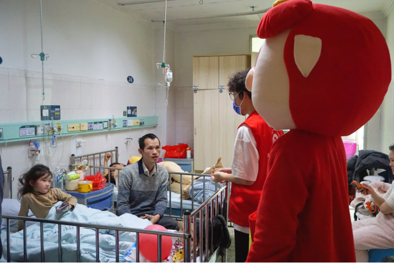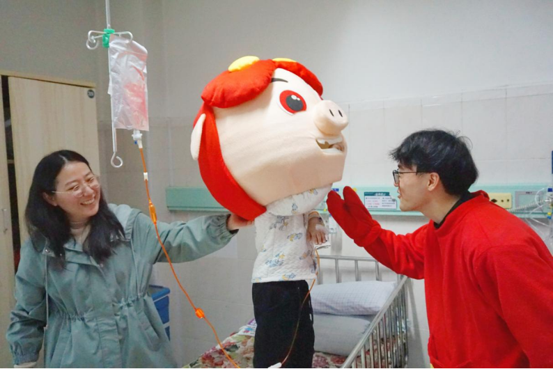 “卡通人物组”的志愿者扮演成孩子们喜爱的角色,走进了各个儿科病房,对陪护的家长说明来意,欢迎孩子们去他们精心布置的房间玩。