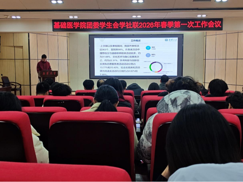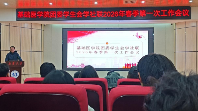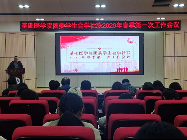 为统筹推进新学期团学工作,明确发展方向,凝聚奋进力量,3 月 19 日中午,基础医学院团委学生会学社联 2026 年春季第一次工作会议在医研楼学术报告厅顺利召开。基础医学院党委副书记卢清华、基础医学院学工室主任李翼、基础医学院团委书记金锦涛,学风建设专干、24 级辅导员胡奉佳,宿管专干、25 级辅导员夏泽华出席会议,团学会各部门负责人参会。