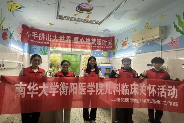 为践行雷锋精神,提升专业素养,2026年3月20日,南华大学基础医学院青年志愿者工作部的5名志愿者,走进南华大学附属第一医院儿科住院部输液室开展“小手拼出大世界,童心绘就暖时光”临床关怀活动。他们以趣味互动搭配健康科普的暖心方式,为住院患儿送去贴心陪伴,尽力抚平他们治疗期间的不安与焦虑。