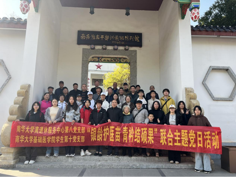 为加强党性教育,激扬青春斗志,2025年11月28日,南华大学基础医学院学生第十党支部、学生第十一党支部与离退休第八党支部联合开展党日主题活动。支部书记刘运初老师、苏玲老师、离退休党员代表、学生党员、25级新生参观南岳游击干部训练班陈列馆,在实践中追寻抗日印迹、传承爱国精神。